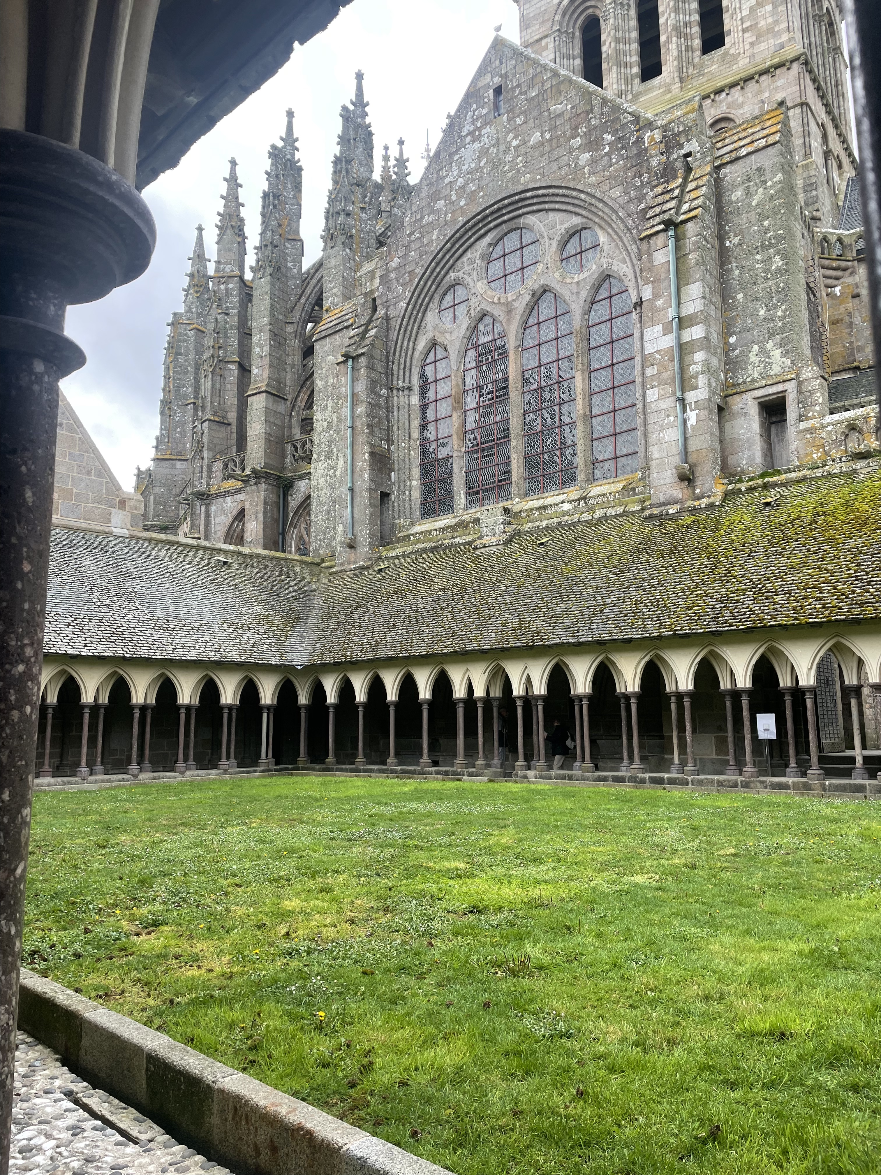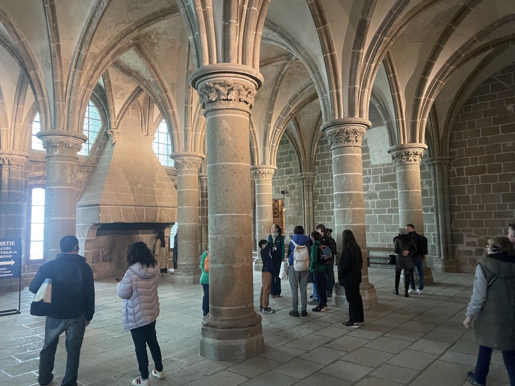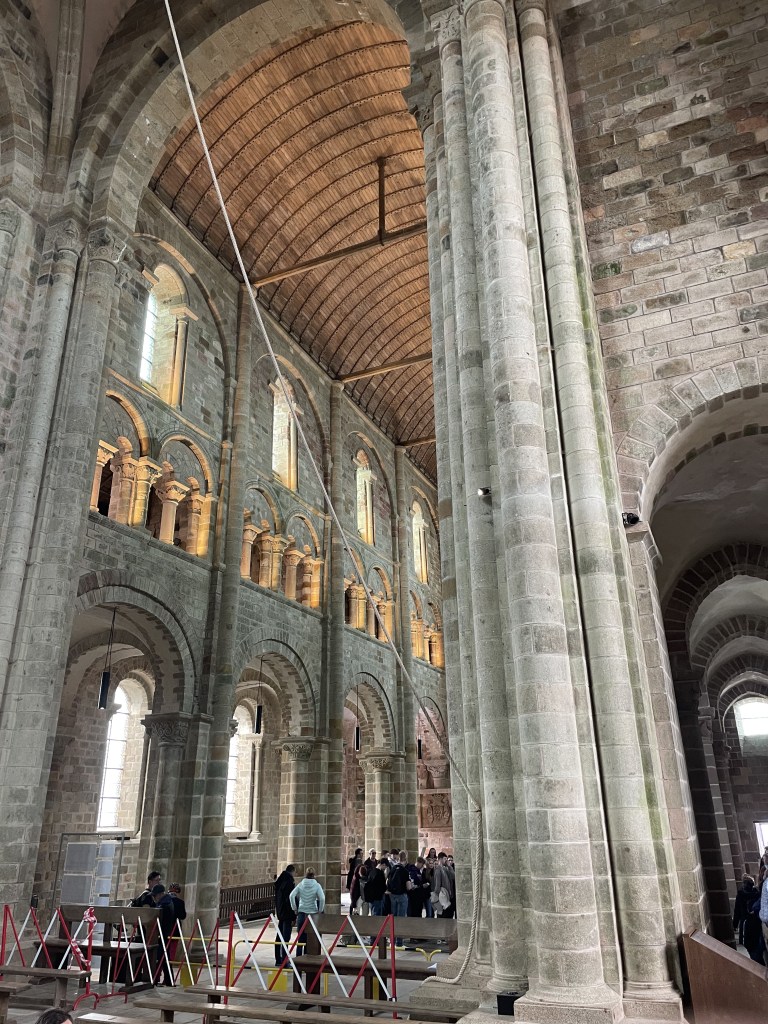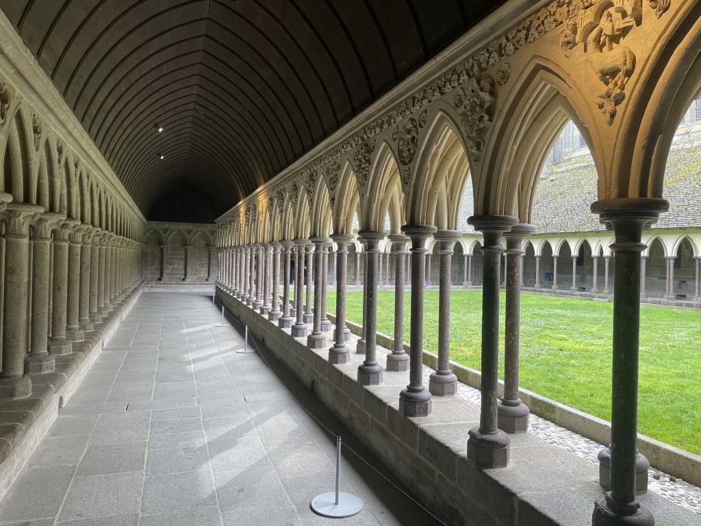 We took the guided tour of the abbey, which was fascinating. I think the biggest thing I took away was that, even though the Mont Saint Michel seems kind of eternal, it’s actually a constant work in progress. Several sections have collapsed over the centuries and have been rebuilt… or not. In the center of the cloister, what is now lawn used to be a lovely garden, but it was leaking into the library below, so they had to tear it out a few years ago.