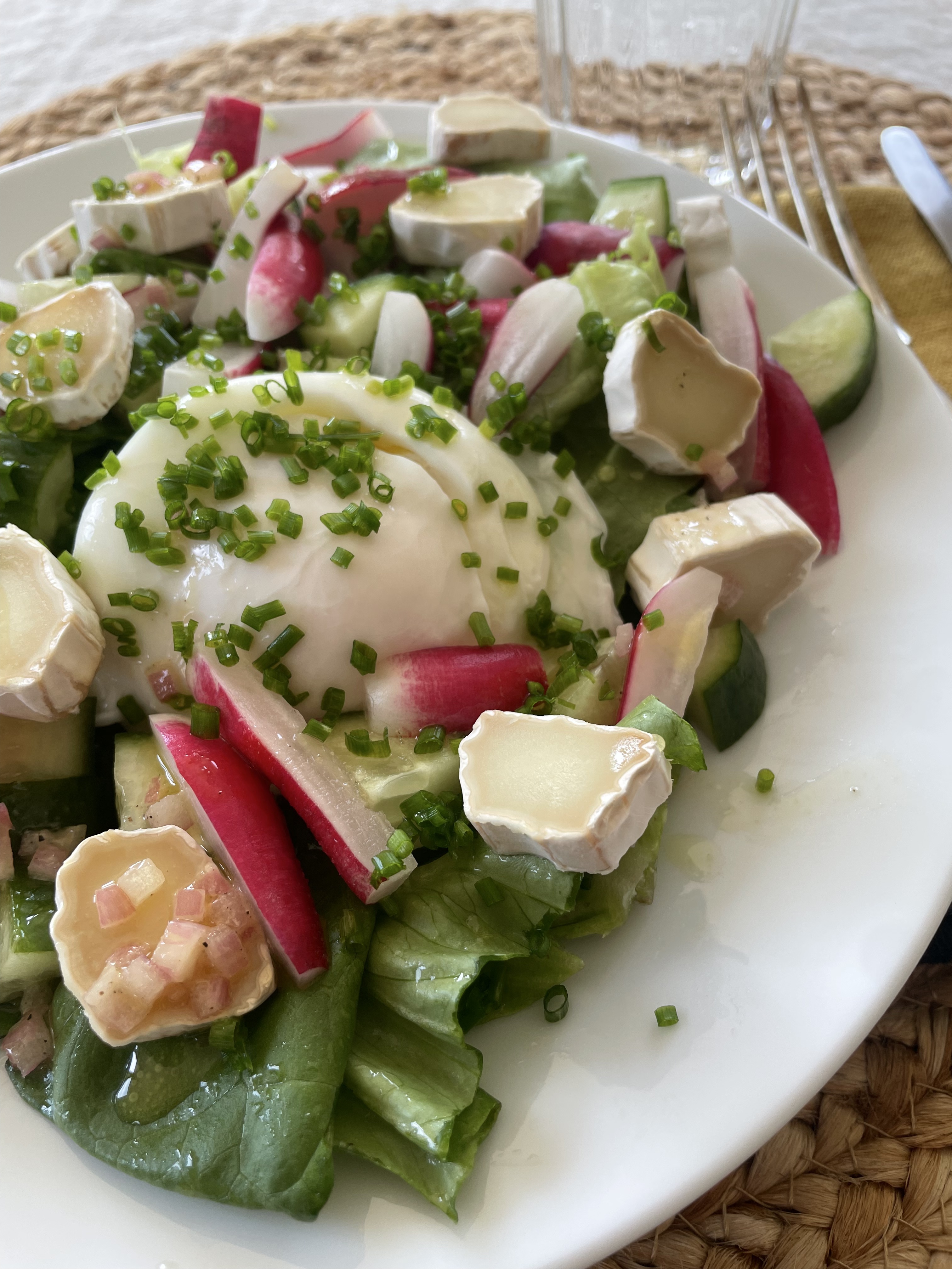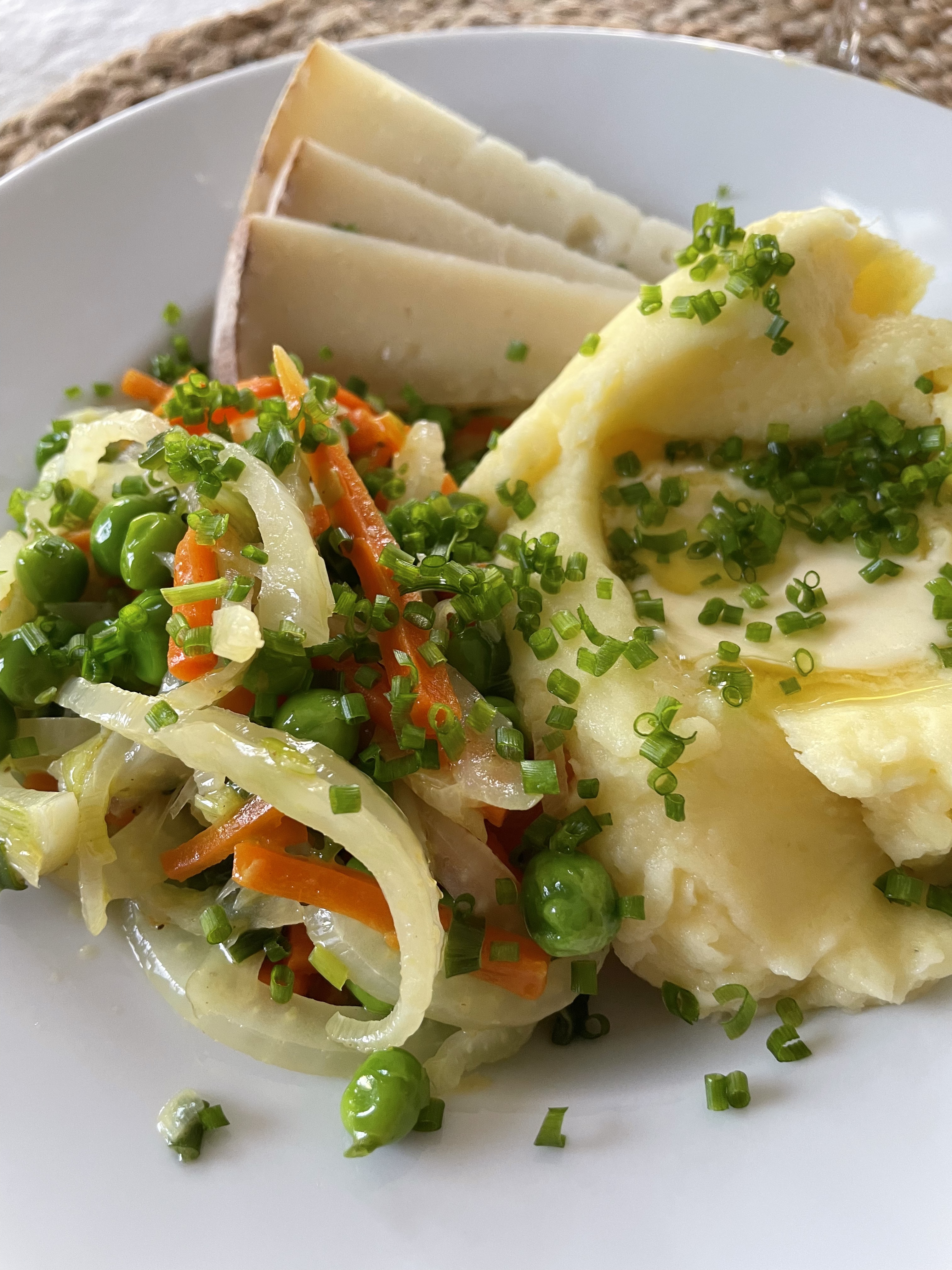 So for lunch today I made a salad with a poached egg, goat cheese, radishes and cucumbers. And for dinner I sauteed peas and carrots and fennel and green onions, and had that with Ossau Iraty cheese (I think) and mashed potatoes with creme fraiche and chopped chives scattered over it all. Gotta love chives!